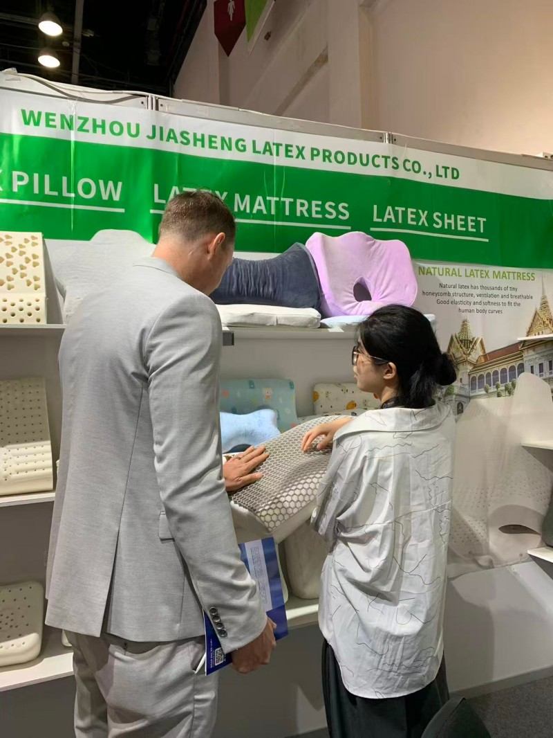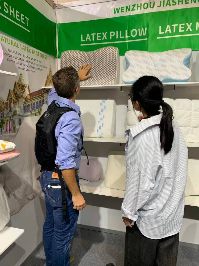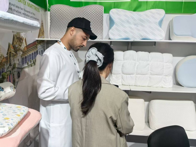Op deze Dubai Sleep Exhibition zijn we vereerd om onze slaapgerichte kussens aan bezoekers van over de hele wereld te laten zien. We zijn toegewijd aan het presenteren van twee van de best verkochte kussens op de markt: denatuurlijk latex kussenen het moderne slimme materiaalkussen van traagschuim. De snelle rebound- en anti-allergie-eigenschappen van latex zijn zeer geliefd bij latexliefhebbers. Ondertussen kan de ultieme pasvorm van traagschuim zorgen voor een diepe slaap. Onze diepgaande communicatie met klanten ter plaatse gaf ons het gevoel dat ze op zoek waren naar kussens. Wij zijn ervan overtuigd dat het bieden van gepersonaliseerde keuzes voor verschillende slaapgewoonten de sleutel is tot een goede nachtrust.